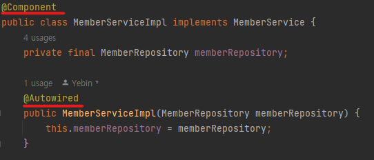 우리가 사용하고자 하는 구현체 클래스 위에 @Component 어노테이션을, 그리고 생성자 위에는 @Autowired를 추가하자. 1) @Component를 붙여 스프링 빈으로 등록하고, 2) 생성자의 @Autowired를 통해 필요한 구현체의 의존 관계를 자동적으로 주입해주는 역할을 한다.