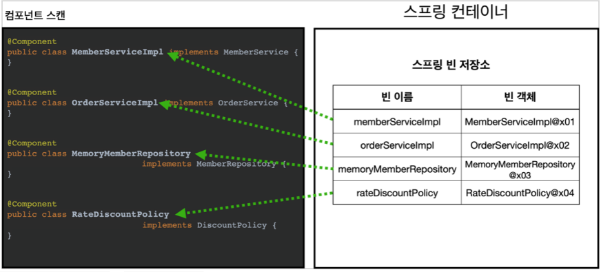 (여기서 컴포넌트 대상은, MemoryMemberRepository, RatedDiscoutPolicy, MemberServiceImpl, OrderServiceImpl 구현체 클래스들이 된다.)