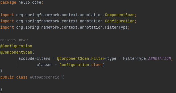 (기존의 AppConfig를 이용한 설정 정보는 제외시키기 위해 excludeFilters를 사용했다.)