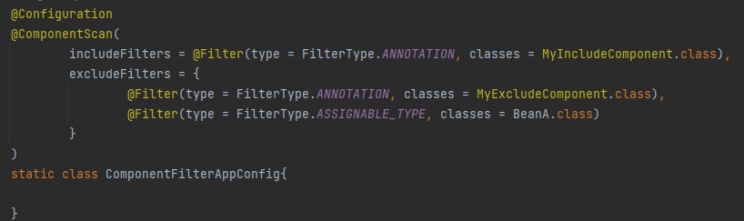 @ComponentScan의 옵션으로 위에서 만든 MyInlcludeComponent와 MyExcludeComponent 클래스 정보를 각각 includeFilters, ExcludeFilters 의 대상 클래스 지정해주도록 한다.