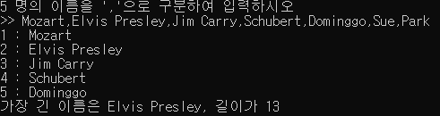 cout << "5 명의 이름을 ','으로 구분하여 입력하시오"<<endl<<">> ";