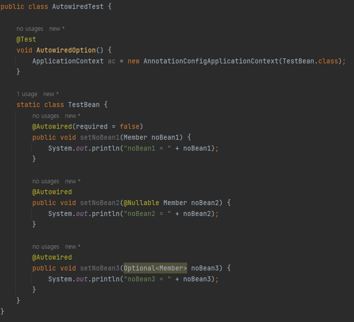 다음과 같이 AutowiredTest 에 TestBean 이라는 static class를 만들어, 인자로 Member 객체를 받는 3가지 메서드를 다음과 같이 작성하고 AutowiredOption 테스트 코드를 실행해보자.