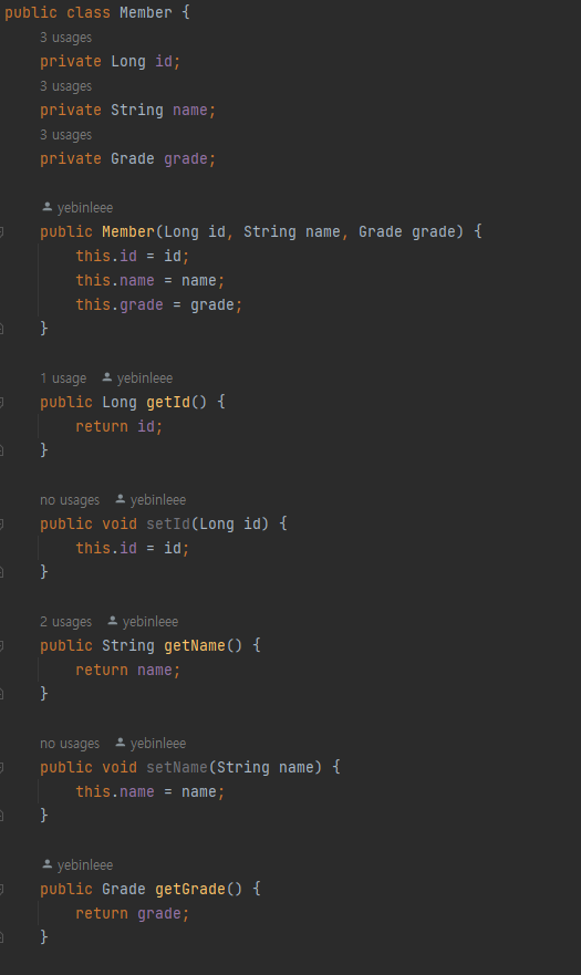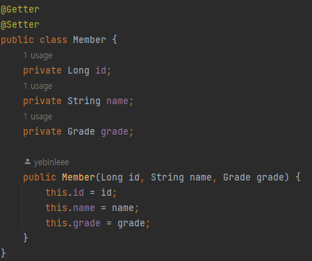 다음과 같이 멤버 변수가 3개만 있음에도, 작성해야 할 getter, setter 메서드가 벌써 6개이다.