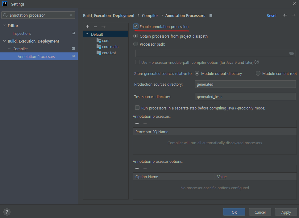 2. settings의 build, execution and deployment > compiler 에서 annotation processor 을 검색하여 enable annotation processing 을 클릭하여 어노테이션 프로세싱을 허용하도록 하자.