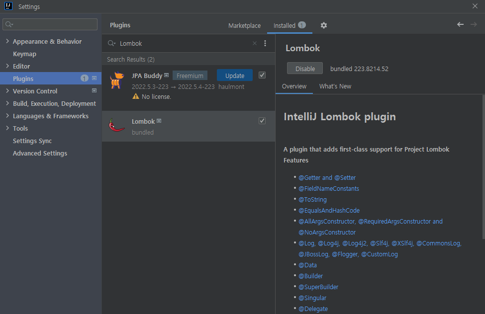 1. settings -> plugin 에서 Lombok을 검색하여 설치 실행을 하고,