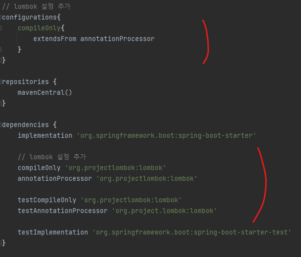 build.gradle 에서 다음과 같이 configurations과 dependencies 부분에 추가를 해주자.