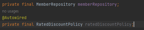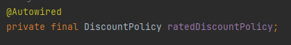 이후 OrderService 구현 객체에서 DiscountPolicy에 대해 의존 관계 자동 주입을 설정하면,