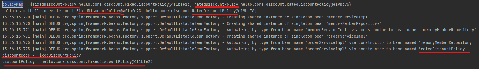 이를 실행해 보았을 때, 아래와 같이 policyMap의 경우 fixedDiscountPolicy와 ratedDiscountPolicy 가 키 값으로, 그리고 각각의 객체 참조값이 value 을 출력하는 것을 볼 수 있다.