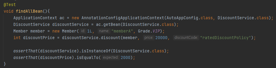 ac.getBean() 을 이용해 DiscountService의 구현 객체들을 가져와, 위에서 만든 discountService 객체의 discount() 메서드를 실행하여 동적으로 구현 객체 빈을 직접 선택해보도록 하자.