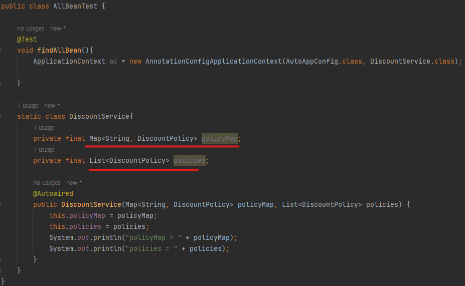 필드에 String을 Key 값으로, DiscountPolicy 인터페이스를 Value 값으로 하는 policyMap, 그리고 DiscountPolicy 리스트인 policies를 선언하고, 생성자 파라미터를 통해 이를 받아와 각 필드를 초기화하도록 하자.