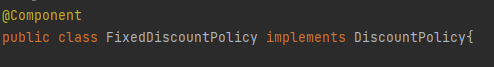 - 이때, DiscountPolicy 구현 객체들인 FixedDiscountPolicy, RatedDiscountPolicy는 모두 스프링 빈으로 등록되어 있다. 스프링 빈으로 등록한 AutoAppConfig는 컴포넌트 스캔을 통해 @Component 가 붙어 있는 모든 객체들을 스프링 빈으로 자동 등록하는 설정 정보 기능을 사용했기 때문이다.