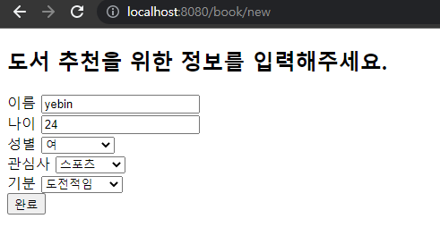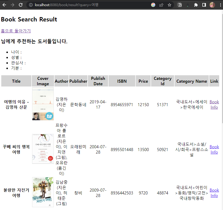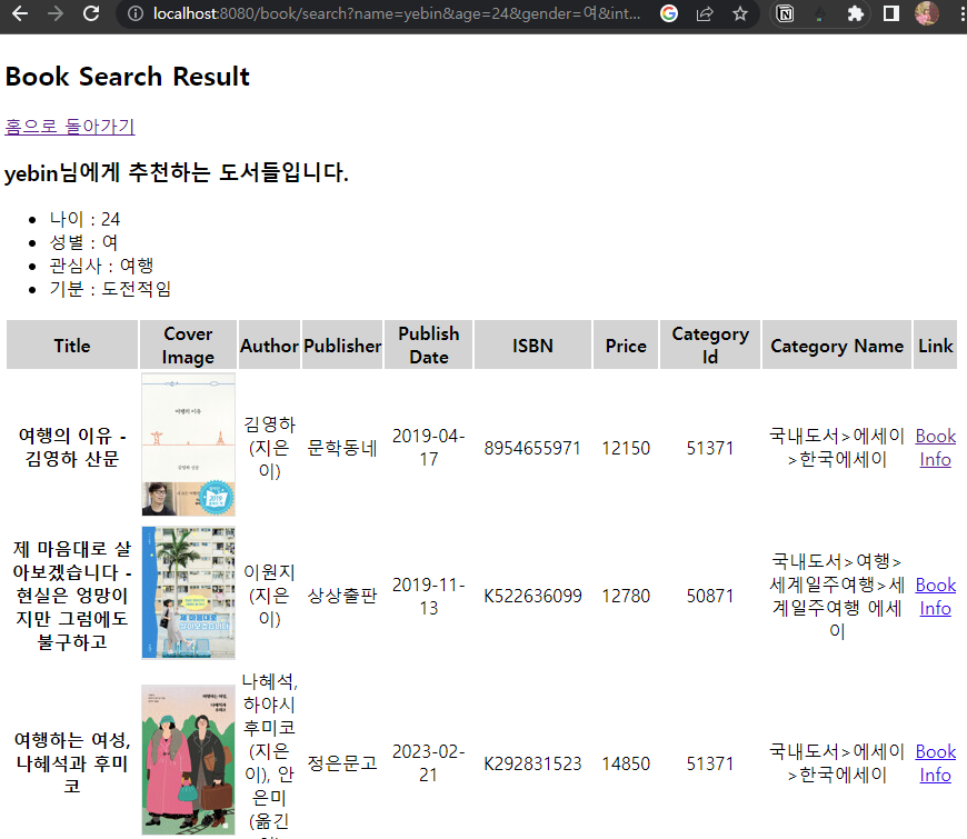 선택된 관심사에 맞게 추천 도서 목록을 반환한 페이지는 다음과 같다.
