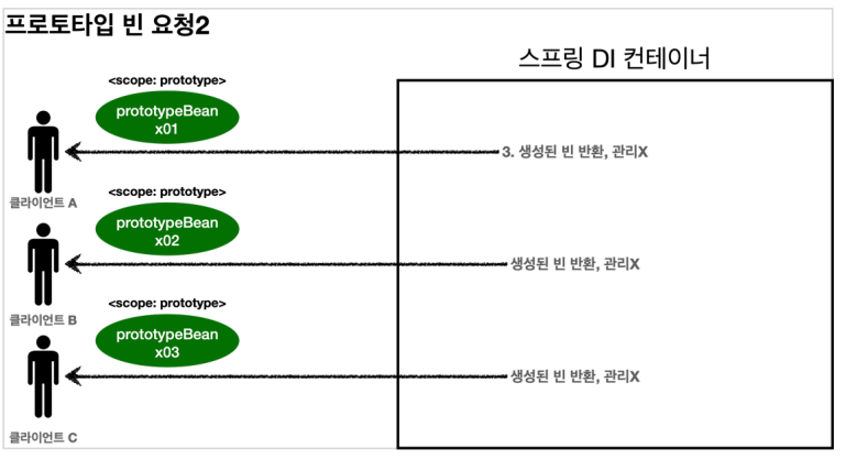 클라이언트가 프로토타입 스코프의 빈을 컨테이너에 요청 시, 컨테이너는 프로토타입 빈을 생성하고 필요한 의존 관계를 주입하여 클라이언트에 반환한다.