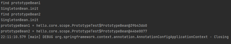아래 Singleton과 Prototype Bean 두 개를 생성하여 각각의 주소를 확인해보자.