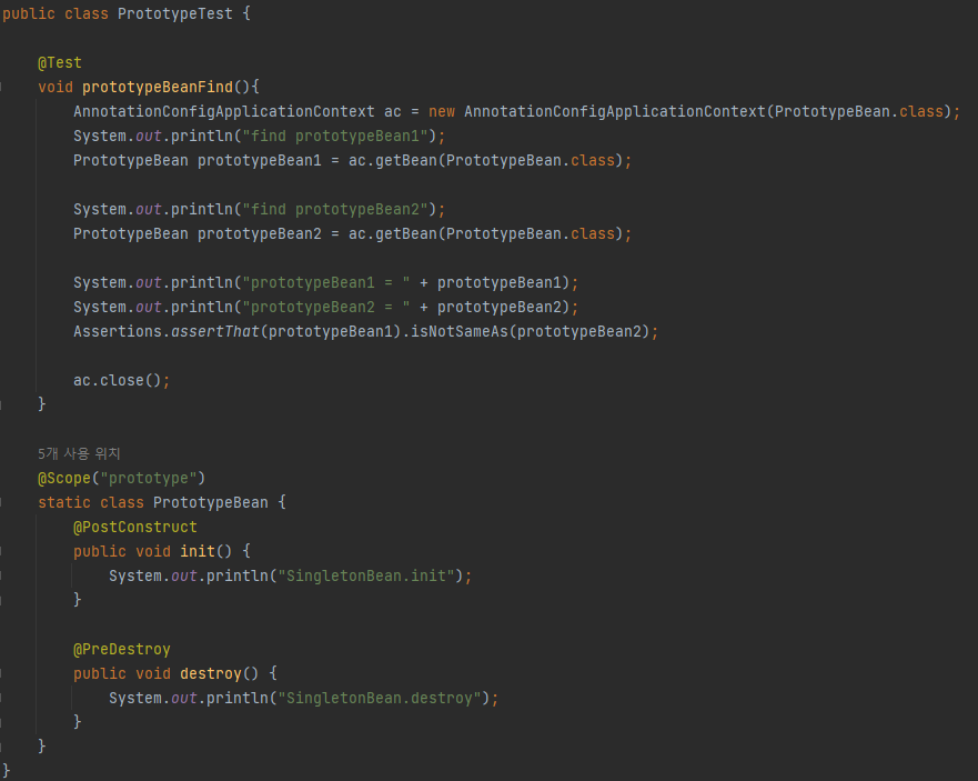 이번에는 protoype scope를 지정한 PrototypeBean 을 각각 두 개 생성하는 경우이다.