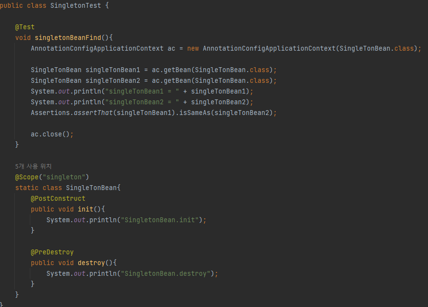 결과를 보니, 생성한 두 빈의 주소가 같은 것을 확인할 수 있다.