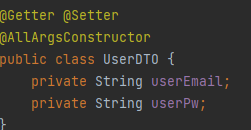 @AllArgsConstructor을 사용해 userEmail, userPw 두 필드를 인스턴스 생성시 필수적으로 넣는 arugment로 설정해주엇다.