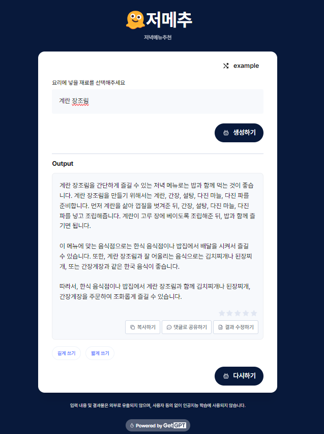 팀원분이 소개해주셨던 getgpt의 저메추 서비스(https://getgpt.app/play/OYWdTCSaIF?provider=google) 에서 아이디어를 얻었습니다. 요리에 넣을 재료를 사용자로부터 입력받아 이를 기반으로 만들 수 있는 요리를 소개해주는 '저메추' 서비스를 벤치마킹하였습니다.