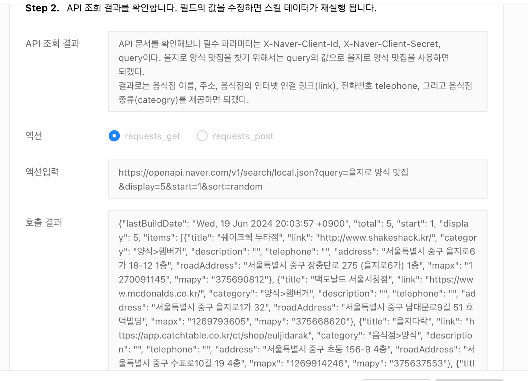 실제로 API에 필요한 값들을 포함하고, API를 호출하여 얻는 값 중 원하는 결과값만을 도출하도록 학습을 진행한