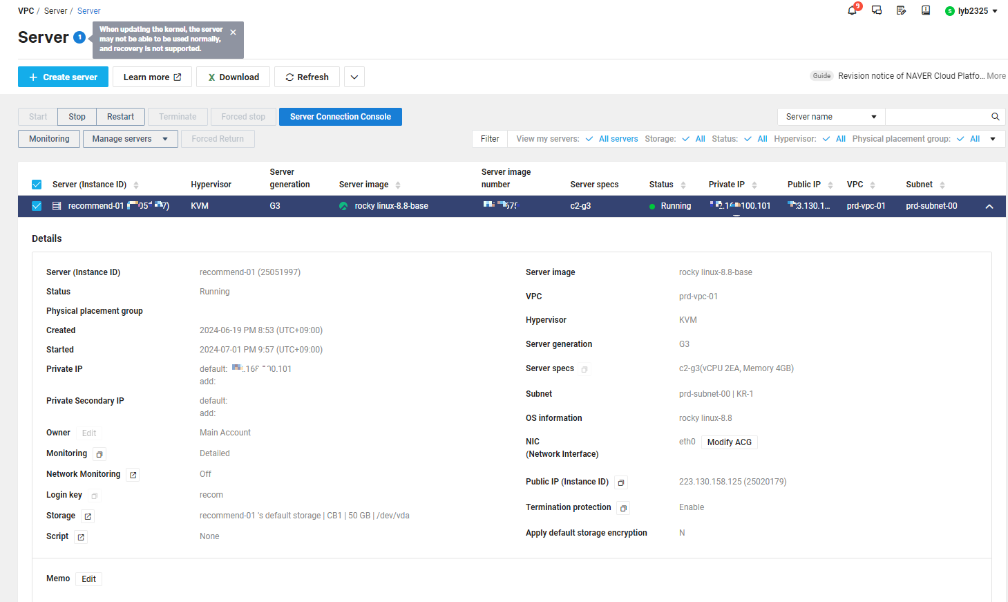 아래 Naver Cloud Platform 콘솔을 통해 여러 네트워크 서비스 및 인프라(Server, Public IP, Load Balancer)들을 쉽게 관리할 수 있었습니다.