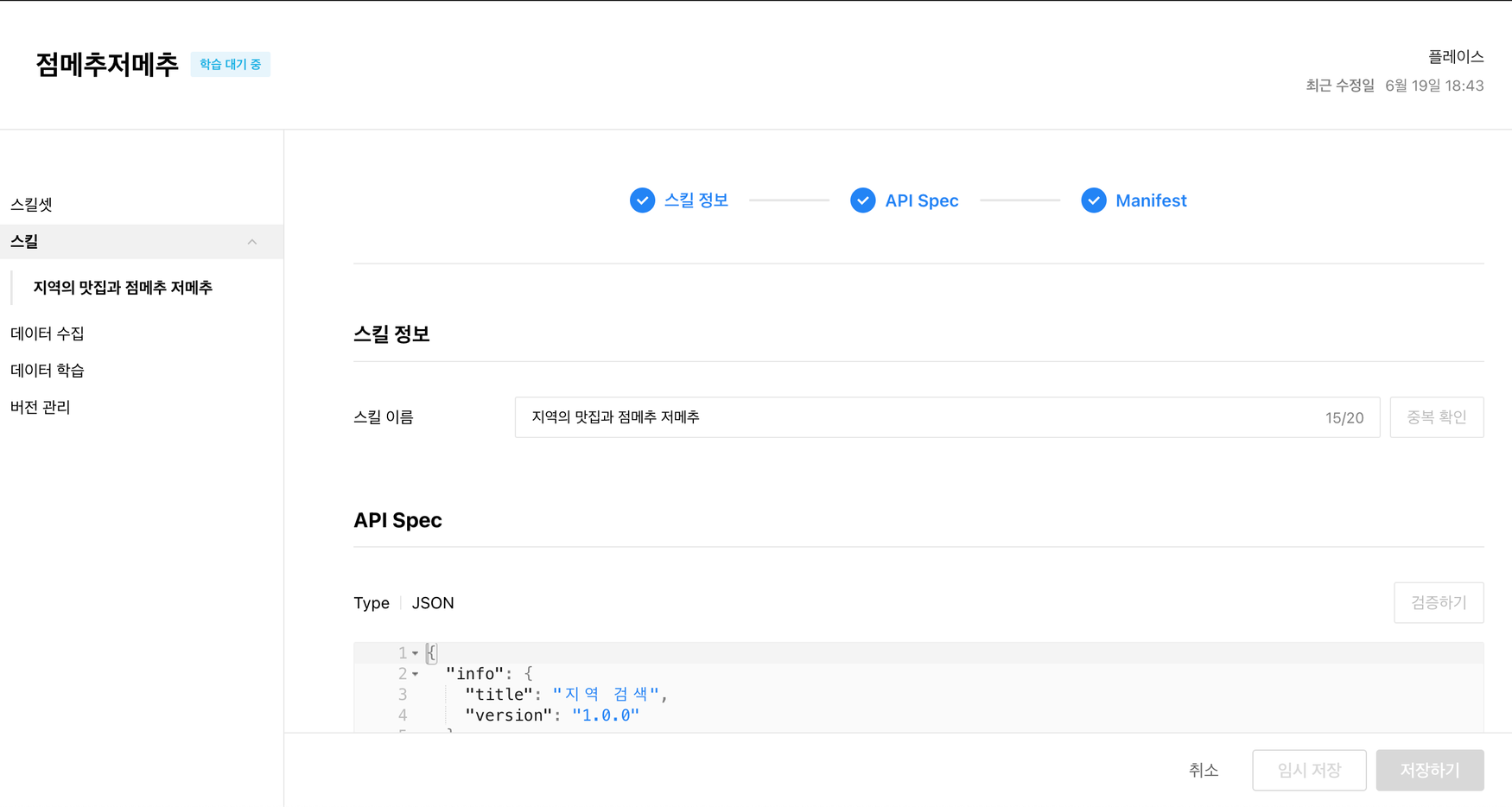 세부적으로 장소와 음식 카테고리 기반으로 구체적인 음식점 검색을 하기 위해 스킬셋을 생성하여 모델 학습을 진행하는 방식을 채택했습니다.
