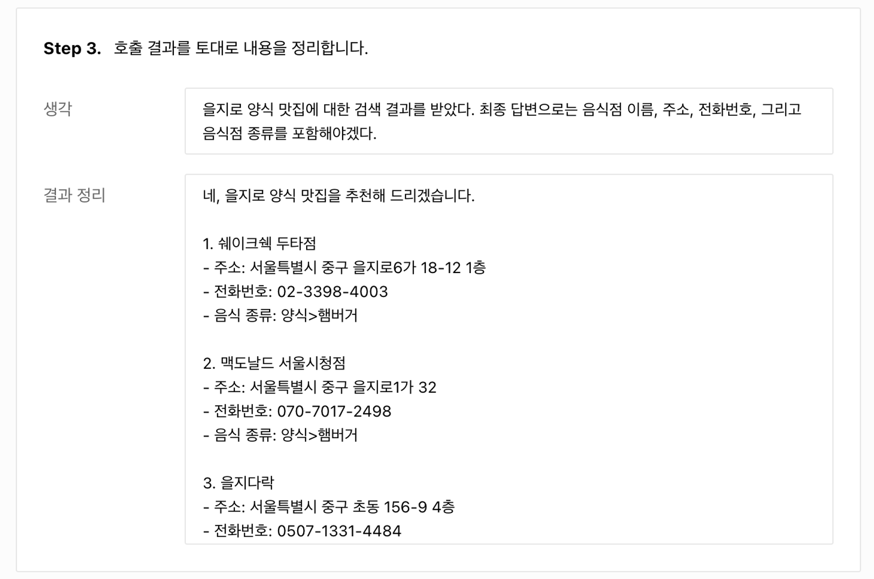 사용자가 위치와 음식 종류 두 가지를 입력하고 나면, 아래와 같이 결과가 도출됩니다.