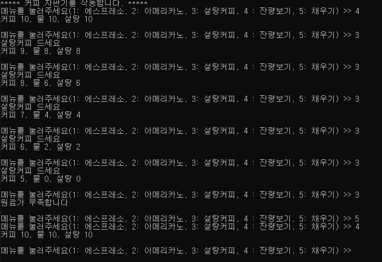 cout << "메뉴를 눌러주세요(1: 에스프레소, 2: 아메리카노, 3: 설탕커피, 4 : 잔량보기, 5: 채우기) >> ";